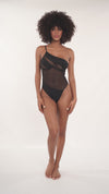 Asymmetrical Black and Mesh One-Piece - Underwire Support with Brazilian Bottom
