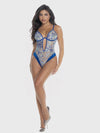 Bathed in a deep Fantasy Blue hue, this sexy bodysuit glistens with intricate sequin floral embroidery against sheer mesh. Bold satin panels contour your hips and frame your curves, while a daring front cut-out elongates the torso. Brazilian back coverage and delicate picot edges enhance the silhouette for a captivating finish.